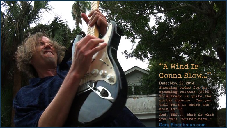 FACEBOOK (11/23/14): Shooting new video this week for some of next years projects. THIS photo is from the performance of "A Wind Is Gonna Blow", which is quite a blues rock workout with a fairly lengthy guitar solo (that I was REALLY getting into playing). We shot this footage in the Roser Park neighborhood of St. Petersburg (FL). It's quite a breathtaking area with an atmospheric vibe that makes me think of New Orleans. I like just walking around down there. While I was playing guitar, in the middle of the street, I drew a few curious on-lookers my way who seemed to enjoy the moment. I was also dodging cars, sometimes not realizing until they were RIGHT up on me... but they was cool baby. And all-in-all it was a smashing good time.